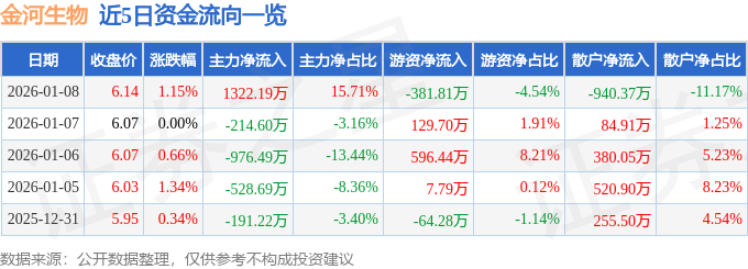 证券之星消息,截至2026年1月8日收盘,金河生物(002688)报收于6.14元,上涨1.15%,换手率1.84%,成交量13.74万手,成交额8417.82万元。