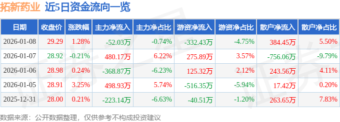 证券之星消息,截至2026年1月8日收盘,拓新药业(301089)报收于29.29元,上涨1.28%,换手率2.62%,成交量2.38万手,成交额6993.7万元。