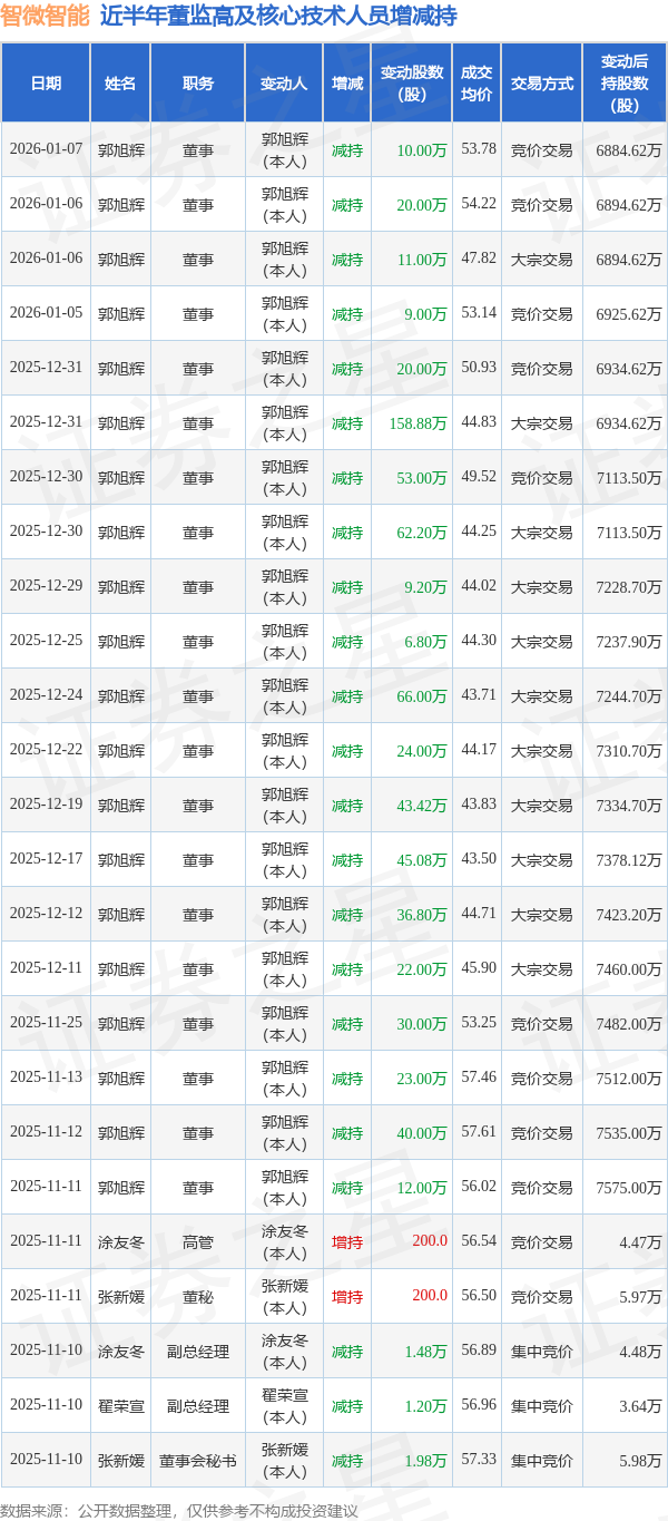 智微智能近半年内的董监高及核心技术人员增减持详情如下: