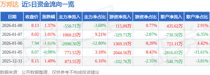 证券之星消息,截至2026年1月8日收盘,万邦达(300055)报收于8.13元,上涨1.37%,换手率2.91%,成交量18.44万手,成交额1.5亿元。