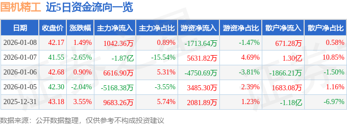 证券之星消息,截至2026年1月8日收盘,国机精工(002046)报收于42.17元,上涨1.49%,换手率5.27%,成交量27.88万手,成交额11.66亿元。