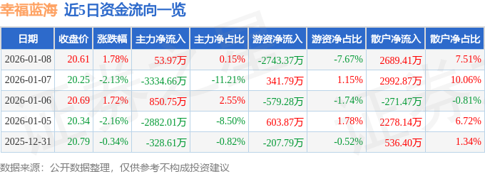 证券之星消息,截至2026年1月8日收盘,幸福蓝海(300528)报收于20.61元,上涨1.78%,换手率4.67%,成交量17.39万手,成交额3.58亿元。