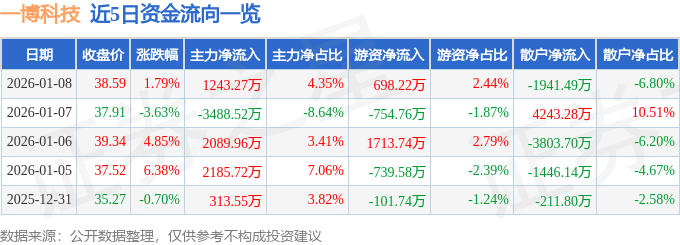 证券之星消息,截至2026年1月8日收盘,一博科技(301366)报收于38.59元,上涨1.79%,换手率9.74%,成交量7.43万手,成交额2.86亿元。