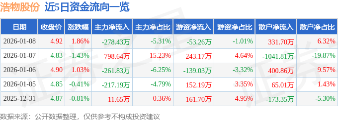 证券之星消息,截至2026年1月8日收盘,浩物股份(000757)报收于4.92元,上涨1.86%,换手率2.01%,成交量10.73万手,成交额5248.2万元。