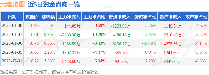 证券之星消息,截至2026年1月8日收盘,元隆雅图(002878)报收于18.96元,上涨1.88%,换手率5.54%,成交量13.07万手,成交额2.46亿元。