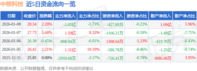 证券之星消息,截至2026年1月8日收盘,中核科技(000777)报收于28.34元,上涨2.2%,换手率16.59%,成交量63.61万手,成交额18.24亿元。