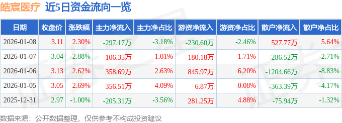 证券之星消息,截至2026年1月8日收盘,皓宸医疗(002622)报收于3.11元,上涨2.3%,换手率3.6%,成交量30.25万手,成交额9358.37万元。