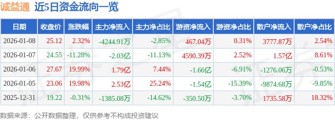 证券之星消息,截至2026年1月8日收盘,诚益通(300430)报收于25.12元,上涨2.32%,换手率22.7%,成交量58.98万手,成交额14.88亿元。