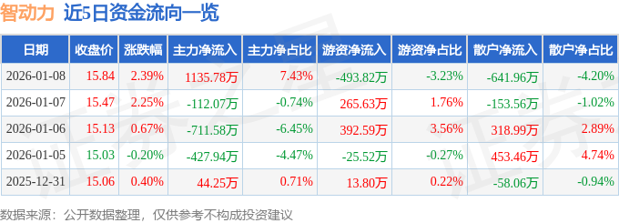 证券之星消息,截至2026年1月8日收盘,智动力(300686)报收于15.84元,上涨2.39%,换手率5.71%,成交量9.7万手,成交额1.53亿元。
