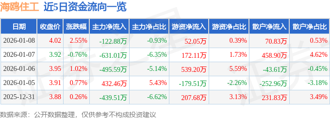 证券之星消息,截至2026年1月8日收盘,海鸥住工(002084)报收于4.02元,上涨2.55%,换手率5.18%,成交量33.37万手,成交额1.33亿元。