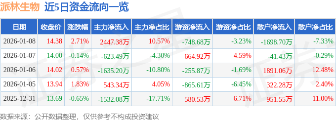 证券之星消息,截至2026年1月8日收盘,派林生物(000403)报收于14.38元,上涨2.71%,换手率1.73%,成交量16.24万手,成交额2.32亿元。