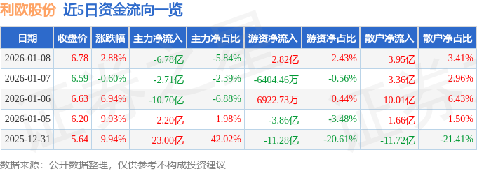 1月8日的资金流向数据方面,主力资金净流出6.78亿元,占总成交额5.84%,游资资金净流入2.82亿元,占总成交额2.43%,散户资金净流入3.95亿元,占总成交额3.41%。