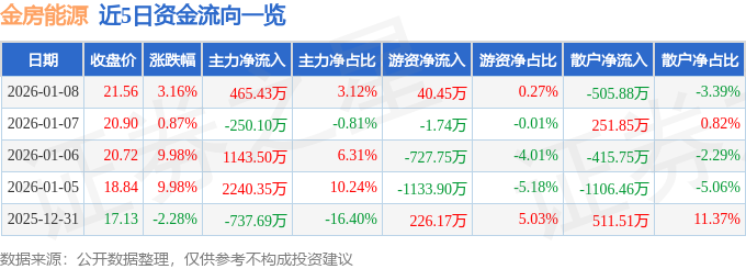 证券之星消息,截至2026年1月8日收盘,金房能源(001210)报收于21.56元,上涨3.16%,换手率7.3%,成交量6.96万手,成交额1.49亿元。