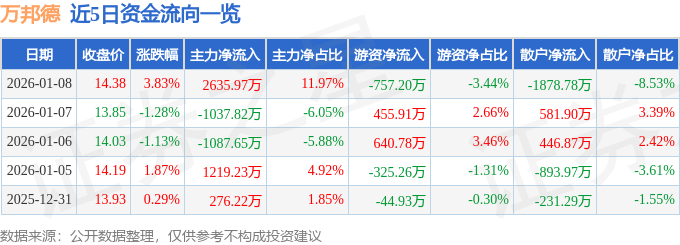 证券之星消息,截至2026年1月8日收盘,万邦德(002082)报收于14.38元,上涨3.83%,换手率2.79%,成交量15.43万手,成交额2.2亿元。