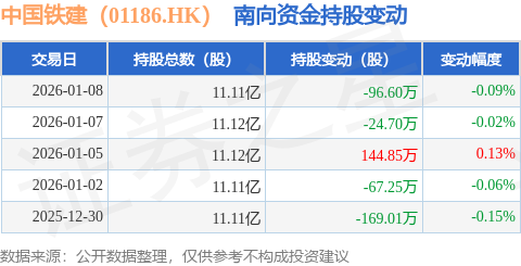 证券之星消息,1月8日南向资金减持96.6万股中国铁建(01186.HK)。近5个交易日中,获南向资金减持的有4天,累计净减持212.71万股。近20个交易日中,获南向资金减持的有12天,累计净减持757.85万股。截至目前,南向资金持有中国铁建(01186.HK)11.11亿股,占公司已发行普通股的53.5%。
