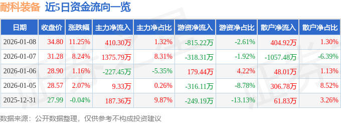 证券之星消息,截至2026年1月8日收盘,耐科装备(688419)报收于34.8元,上涨11.25%,换手率15.49%,成交量9.22万手,成交额3.12亿元。
