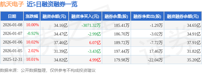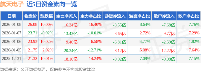 证券之星消息,截至2026年1月8日收盘,航天电子(600879)报收于26.08元,上涨10.0%,涨停,换手率11.91%,成交量393.03万手,成交额99.0亿元。