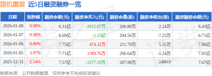 证券之星消息,截至2026年1月8日收盘,国机重装(601399)报收于6.06元,上涨9.98%,已连续涨停2天,换手率3.63%,成交量262.11万手,成交额15.48亿元。