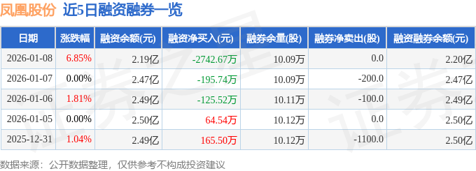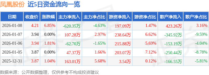 证券之星消息,截至2026年1月8日收盘,凤凰股份(600716)报收于4.21元,上涨6.85%,换手率3.47%,成交量32.45万手,成交额1.34亿元。