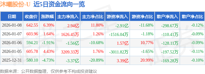 证券之星消息,截至2026年1月8日收盘,沐曦股份(688802)报收于642.55元,上涨6.39%,换手率21.68%,成交量3.93万手,成交额24.93亿元。