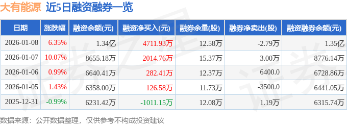 证券之星消息,截至2026年1月8日收盘,大有能源(600403)报收于8.37元,上涨6.35%,换手率7.34%,成交量175.47万手,成交额14.45亿元。