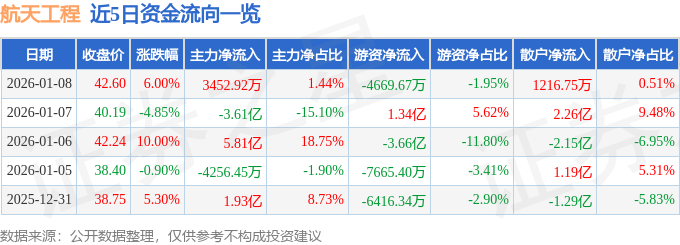 证券之星消息,截至2026年1月8日收盘,航天工程(603698)报收于42.6元,上涨6.0%,换手率10.64%,成交量57.03万手,成交额23.9亿元。