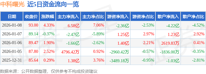 1月8日的资金流向数据方面,主力资金净流入6.58亿元,占总成交额7.06%,游资资金净流出2.36亿元,占总成交额2.53%,散户资金净流出4.22亿元,占总成交额4.52%。