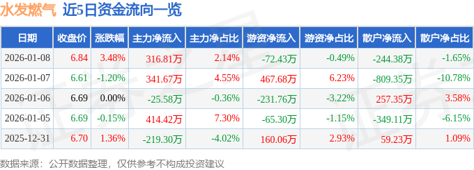 证券之星消息,截至2026年1月8日收盘,水发燃气(603318)报收于6.84元,上涨3.48%,换手率4.76%,成交量21.83万手,成交额1.48亿元。