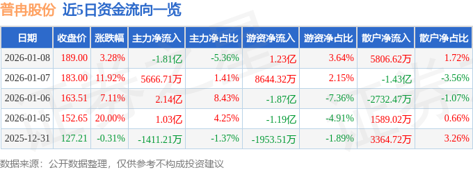 证券之星消息,截至2026年1月8日收盘,普冉股份(688766)报收于189.0元,上涨3.28%,换手率12.04%,成交量17.82万手,成交额33.74亿元。