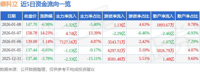 证券之星消息,截至2026年1月8日收盘,德科立(688205)报收于147.7元,下跌6.98%,换手率10.31%,成交量16.32万手,成交额24.33亿元。