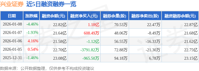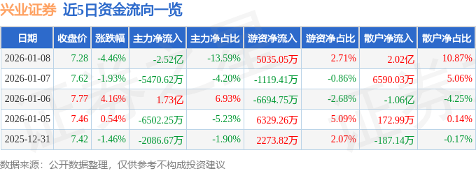 证券之星消息,截至2026年1月8日收盘,兴业证券(601377)报收于7.28元,下跌4.46%,换手率2.93%,成交量253.1万手,成交额18.56亿元。