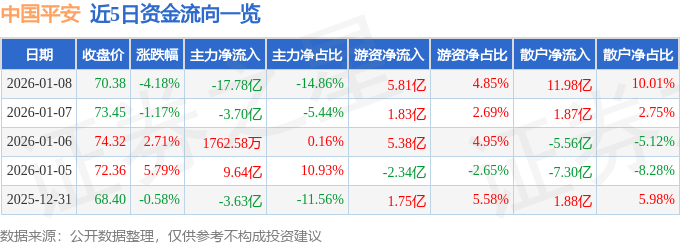 证券之星消息,截至2026年1月8日收盘,中国平安(601318)报收于70.38元,下跌4.18%,换手率1.58%,成交量168.54万手,成交额119.7亿元。