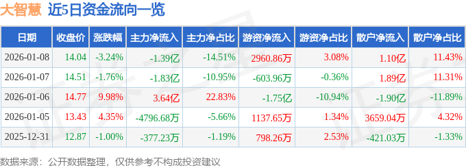 证券之星消息,截至2026年1月8日收盘,大智慧(601519)报收于14.04元,下跌3.24%,换手率3.43%,成交量68.26万手,成交额9.6亿元。