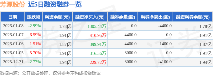 证券之星消息,截至2026年1月8日收盘,芳源股份(688148)报收于9.73元,下跌2.99%,换手率7.81%,成交量39.83万手,成交额3.96亿元。