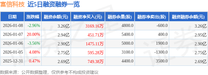 富信科技融资融券信息显示,融资方面,当日融资买入1.4亿元,融资偿还1.08亿元,融资净买入3169.16万元,连续3日净买入累计5095.98万元。融券方面,融券卖出0.0股,融券偿还600.0股,融券余量4800.0股,融券余额28.75万元。融资融券余额3.26亿元。
