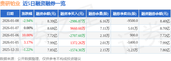贵研铂业融资融券信息显示,融资方面,当日融资买入1.2亿元,融资偿还1.5亿元,融资净偿还2986.87万元。融券方面,融券卖出3100.0股,融券偿还1.26万股,融券余量6.16万股,融券余额126.28万元。融资融券余额8.4亿元。