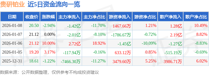 1月8日的资金流向数据方面,主力资金净流出1.42亿元,占总成交额11.7%,游资资金净流入1467.66万元,占总成交额1.21%,散户资金净流入1.28亿元,占总成交额10.49%。