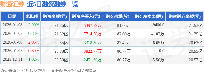 证券之星消息,截至2026年1月8日收盘,财通证券(601108)报收于8.71元,下跌2.9%,换手率1.72%,成交量79.87万手,成交额7.0亿元。