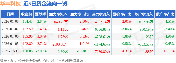 证券之星消息,截至2026年1月8日收盘,华丰科技(688629)报收于104.45元,下跌2.84%,换手率10.33%,成交量18.77万手,成交额20.17亿元。