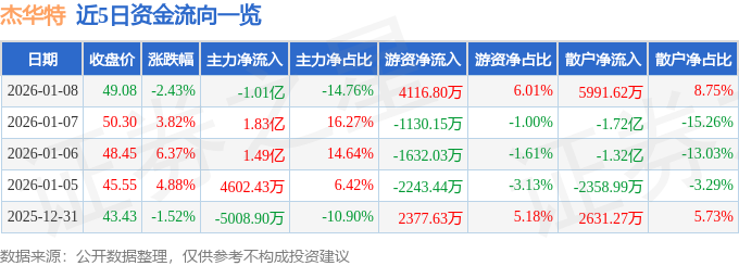 证券之星消息,截至2026年1月8日收盘,杰华特(688141)报收于49.08元,下跌2.43%,换手率3.06%,成交量13.79万手,成交额6.85亿元。