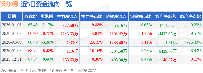 证券之星消息,截至2026年1月8日收盘,沃尔德(688028)报收于65.45元,下跌2.17%,换手率4.01%,成交量6.06万手,成交额4.03亿元。
