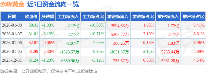 证券之星消息,截至2026年1月8日收盘,赤峰黄金(600988)报收于30.41元,下跌1.93%,换手率4.02%,成交量66.88万手,成交额20.46亿元。