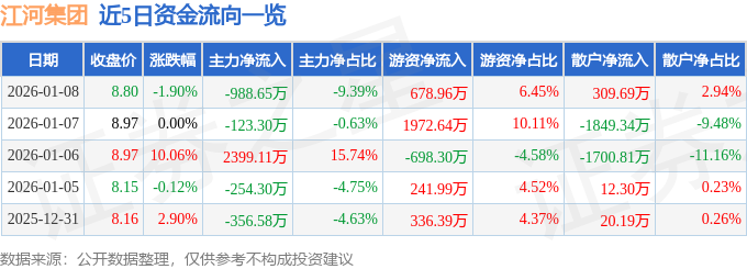 证券之星消息,截至2026年1月8日收盘,江河集团(601886)报收于8.8元,下跌1.9%,换手率1.05%,成交量11.93万手,成交额1.05亿元。
