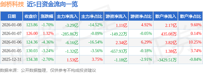 1月8日的资金流向数据方面,主力资金净流出3.29亿元,占总成交额14.52%,游资资金净流入1.11亿元,占总成交额4.92%,散户资金净流入2.17亿元,占总成交额9.6%。