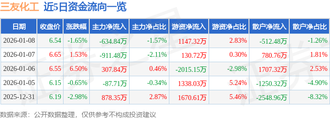 证券之星消息,截至2026年1月8日收盘,三友化工(600409)报收于6.54元,下跌1.65%,换手率3.01%,成交量62.07万手,成交额4.05亿元。