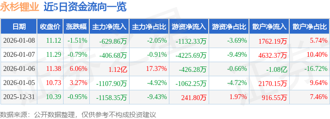 证券之星消息,截至2026年1月8日收盘,永杉锂业(603399)报收于11.12元,下跌1.51%,换手率5.33%,成交量27.29万手,成交额3.07亿元。