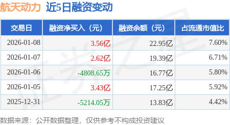 证券之星消息,1月8日,航天动力(600343)融资买入7.84亿元,融资偿还4.28亿元,融资净买入3.56亿元,融资余额22.95亿元,当日融资净买入排名第8,近20个交易日中有11个交易日出现融资净买入。