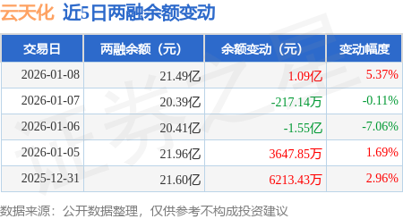 证券之星消息,1月8日,云天化(600096)融资买入3.22亿元,融资偿还2.13亿元,融资净买入1.09亿元,融资余额21.42亿元。