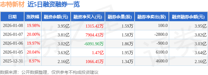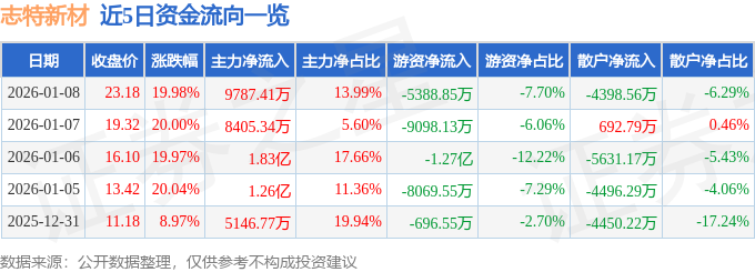 证券之星消息,截至2026年1月8日收盘,志特新材(300986)报收于23.18元,上涨19.98%,已连续涨停4天,换手率7.41%,成交量30.49万手,成交额7.0亿元。