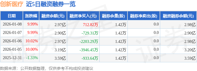 证券之星消息,截至2026年1月8日收盘,创新医疗(002173)报收于31.49元,上涨9.99%,已连续涨停4天,换手率2.2%,成交量9.16万手,成交额2.88亿元。